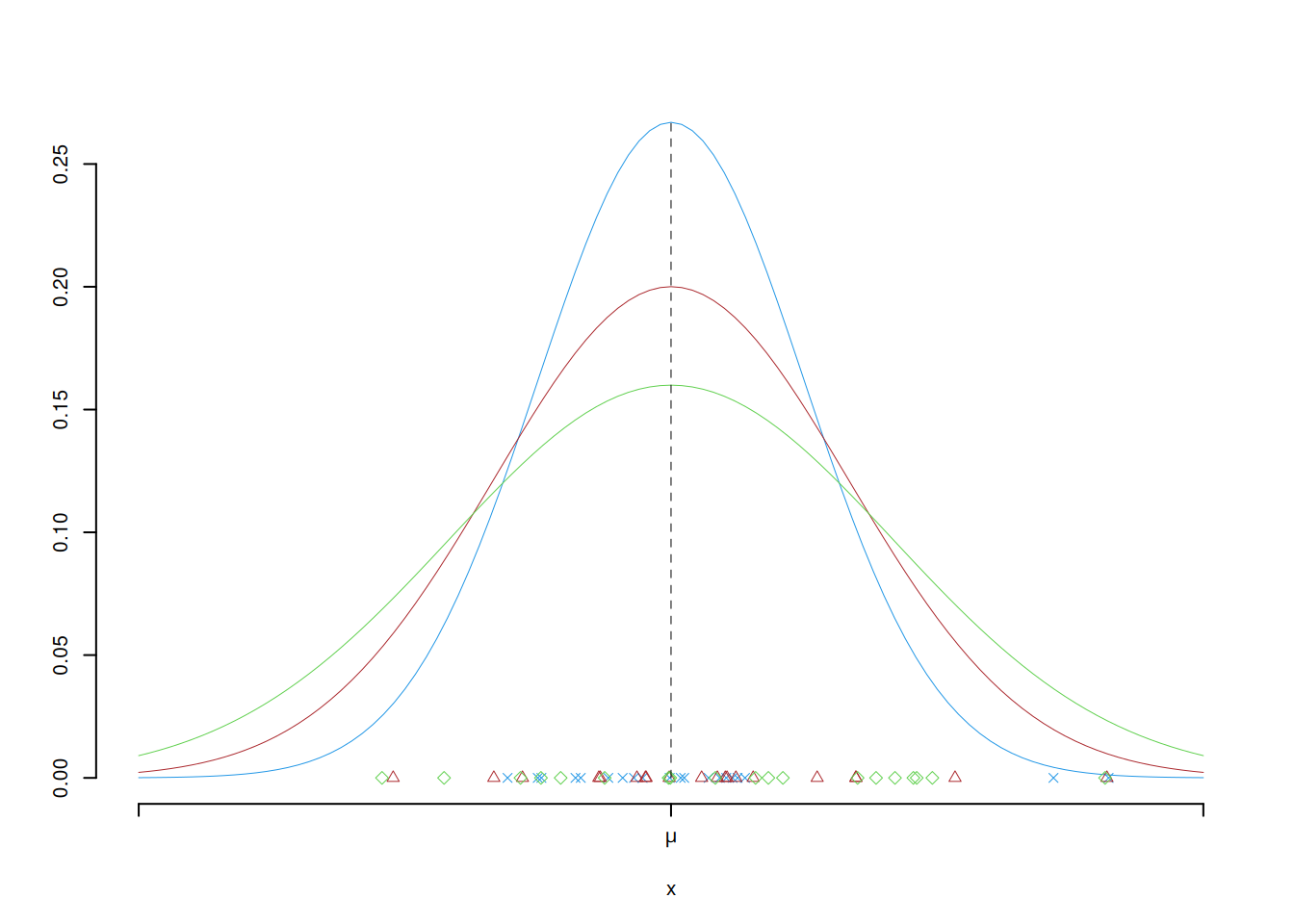 Se si ripetesse l’estrazione un grande numero di volte potremmo vedere i tre stimatori nel grafico qui di seguito. Lo stimatore in con la distribuzione in blu è il più efficiente dei tre: la probabilità che si avveri lontano dal vero parametro è minore che per gli altri due. Mentre lo stimatore in con la distribuzione in verde è il meno efficiente dei tre: la probabilità che si avveri lontano dal vero parametro è maggiore che per gli altri due.