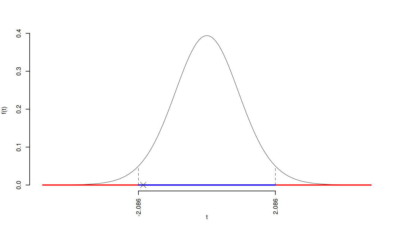 \[\begin{eqnarray*} \frac{\hat\beta_{ 0 } - \beta_{ 0 ;H_0}} {\widehat{SE(\hat\beta_{ 0 })}}&\sim&t_{n-2}\\ t_{\text{obs}} &=& \frac{ ( -0.1736 - 0 )} { 1.167 } = -0.1488 \, . \end{eqnarray*}\]