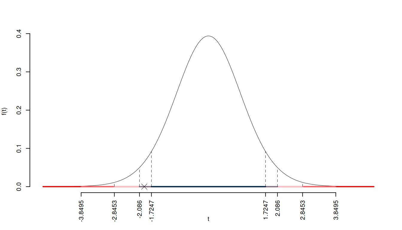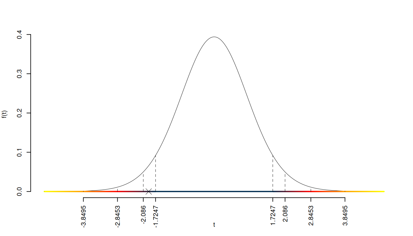 Attenzione il calcolo del \(p_\text{value}\) con la \(T\) è puramente illustrativo e non può essere riprodotto senza una calcolatrice statistica adeguata.\[ 0.1 < p_\text{value}= 0.441028 \leq 1 \]
