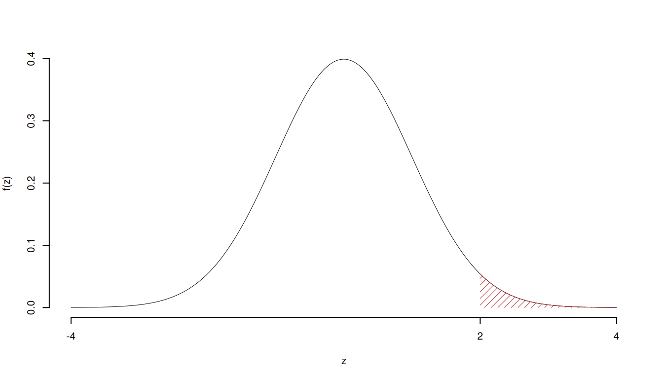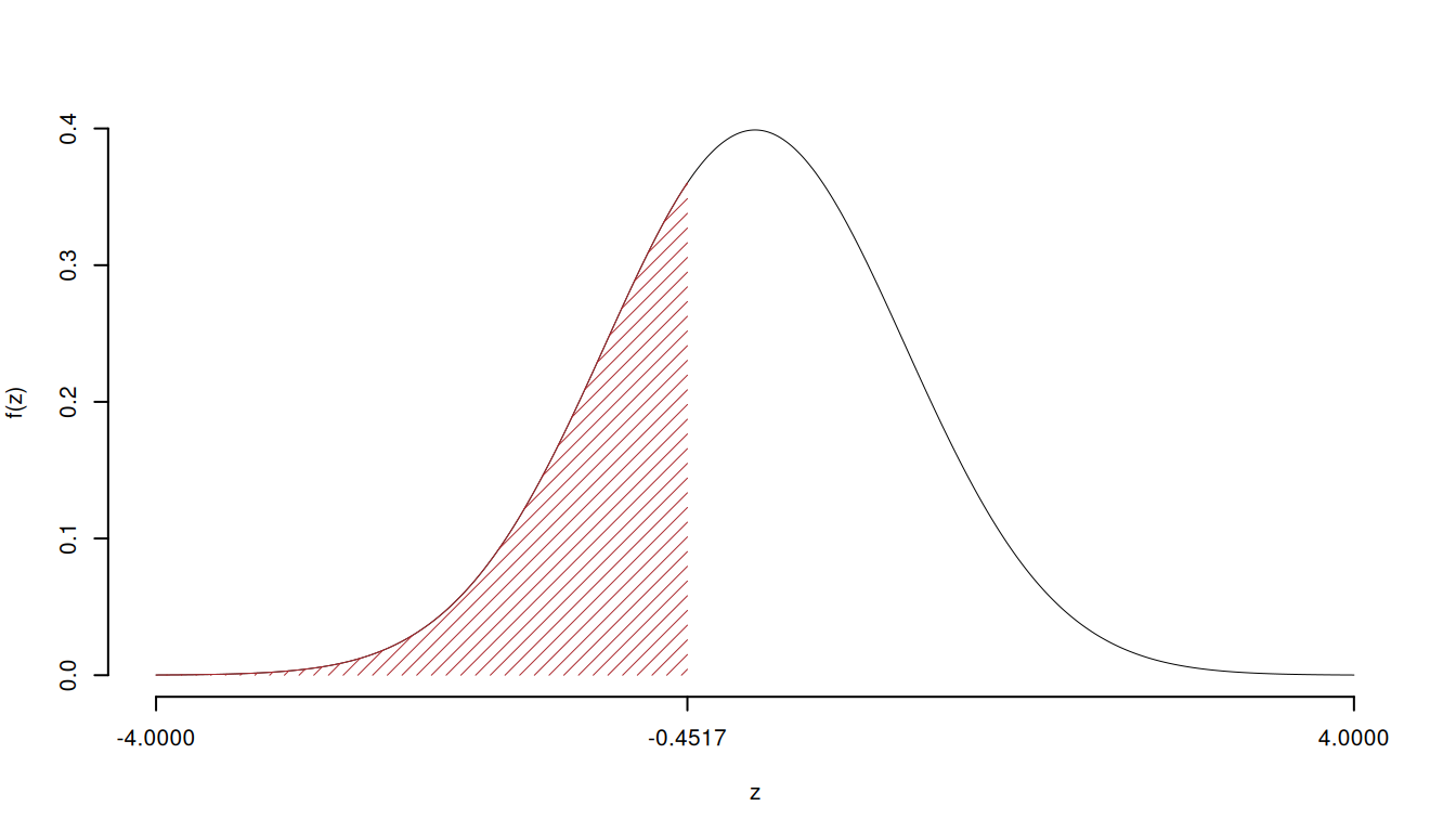 \[\begin{eqnarray*} P( X > 4 ) &=& P\left( \frac { X - \mu }{ \sigma } > \frac { 4 - 3 }{\sqrt{ 2.2 }} \right) \\ &=& P\left( Z > 0.67 \right) \\ &=& 1-P(Z< 0.67 )\\ &=& 1-\Phi( 0.67 ) \\ &=& 0.2514 \end{eqnarray*}\]