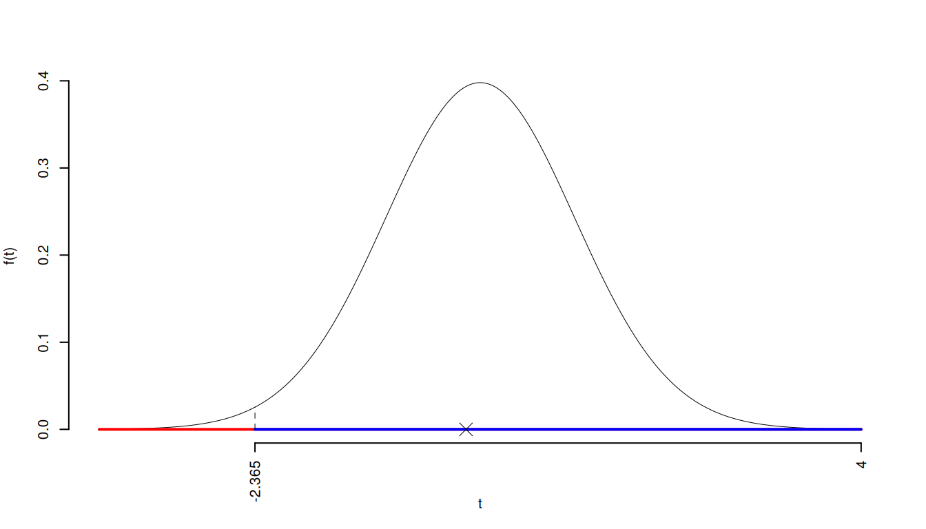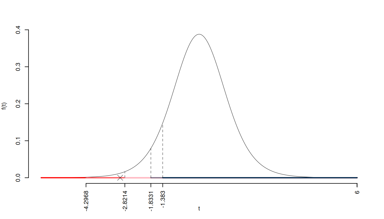 Essendo \(t_\text{obs}=-0.1488>t_{100-2;0.01}=-2.365\) allora rifiuto \(H_0\) al 1%.