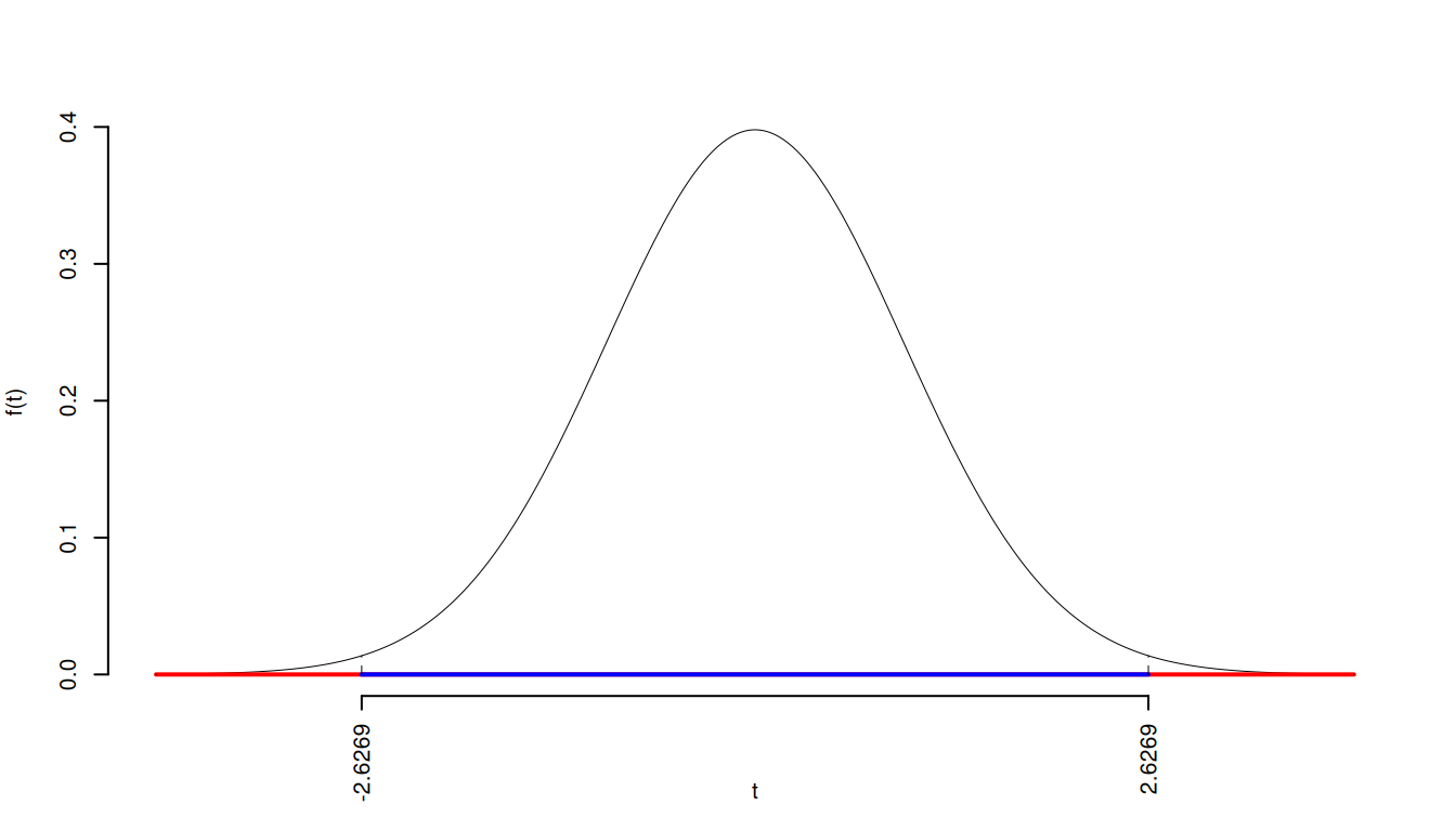 La siginficatitività è \(\alpha=0.01\), dalle tavole osserviamo \(t_{100-2;0.005}=2.6269\).