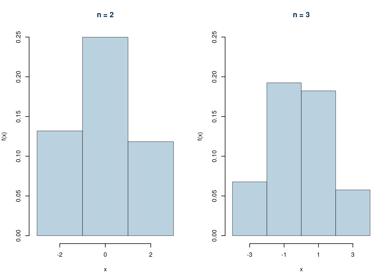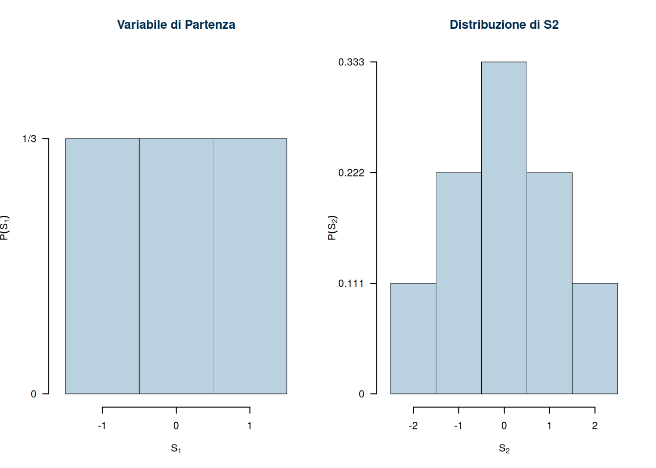 Siano \(X_1, X_2,...,X_n\) \(n\) VC IID con supporto \(S_X=\{-1,0,+1\}\) e con funzione di probabilità \[ \begin{cases} P(X=-1)&=\frac 13\\ P(X=\phantom{-}0)&=\frac 13\\ P(X=+1)&=\frac 13 \end{cases} \] Consideriamo \[ S_2=X_1+X_2 \] il supporto di \(S_2\) sarà \[S_{S_2}=\{-2,-1,0,+1,+2 \} \] \(S_2=-2\) se sia \(X_1=-1\) e \(X_2=-1\), \(S_2=-1\) se sia \(X_1+X_2=-1\) ecc. mettiamo in tabella