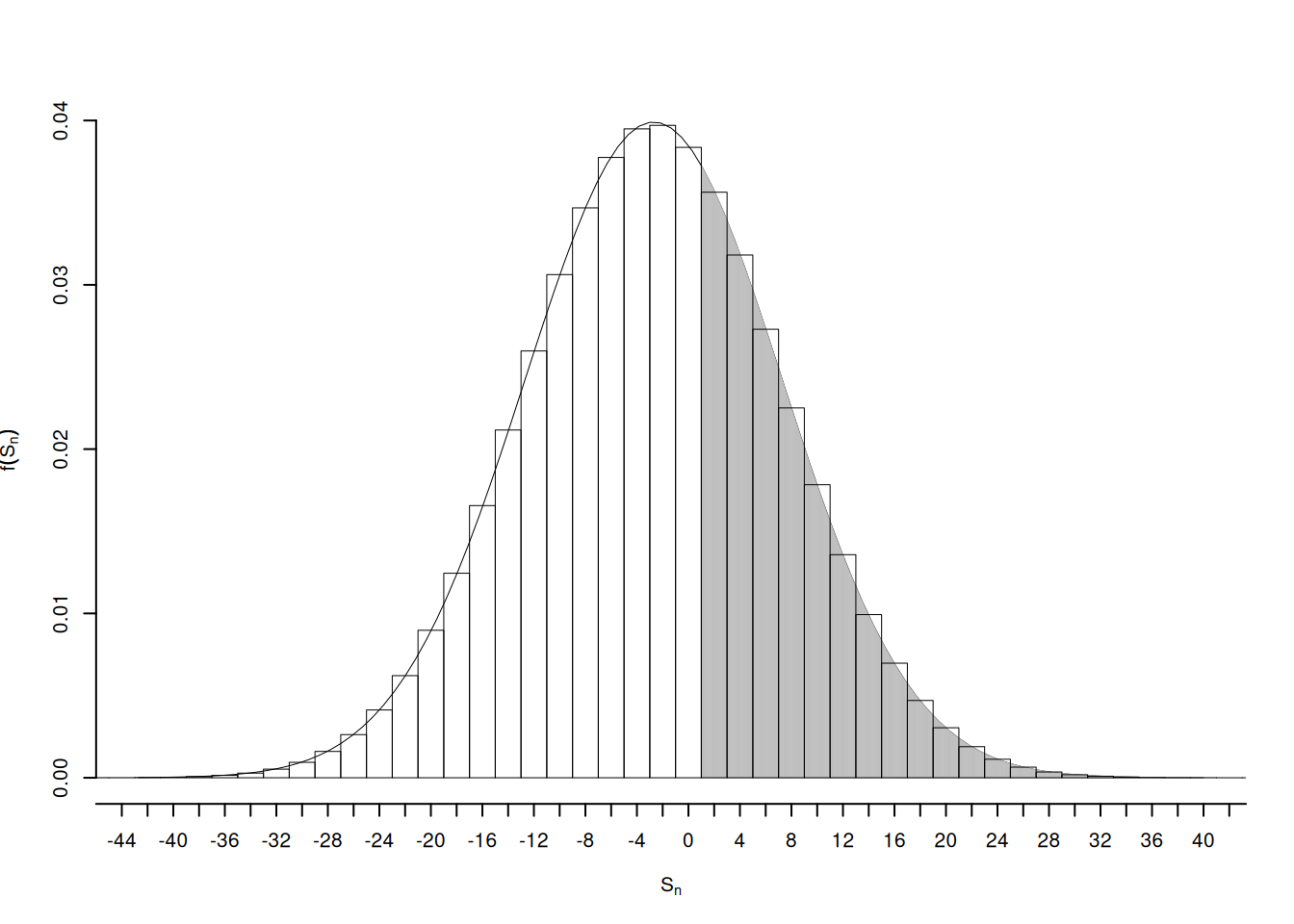I due valori di probabilità esatta 0.3553 e quello approssimato 0.3934 sono diversi nella seconda cifra decimale. Questo è dovuto al fatto che la normale calcola anche parte dell’istogramma della binomiale in zero. Per ovviare e migliorare l’approssimazione basta spostare sulla fine del rettangolo dello zero il calcolo della normale. Senza entrare nel dettaglio si ricava che il rettangolo finisce per \(S_n=1\) e dunque