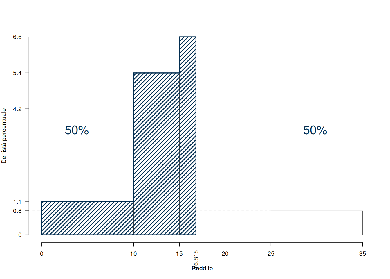 La mediana è quel valore che taglia l’istogramma in due parti, entrambe di area pari al 50% dell’area totale