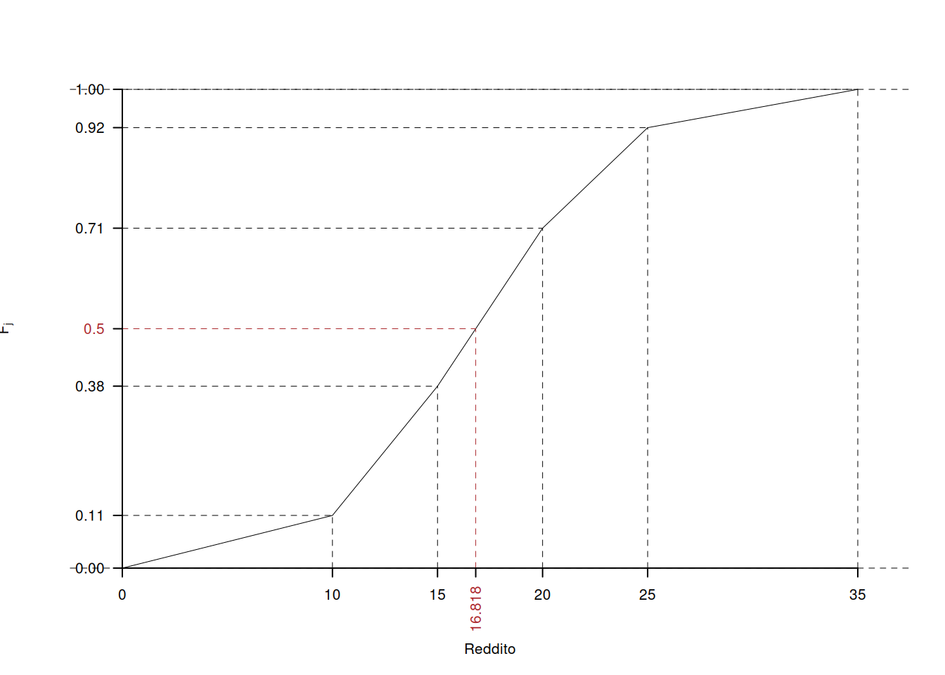 La modalità mediana è la terza \(j=3\), dunque Media Superiore, infatti \(F_3=0.82>0.50\).