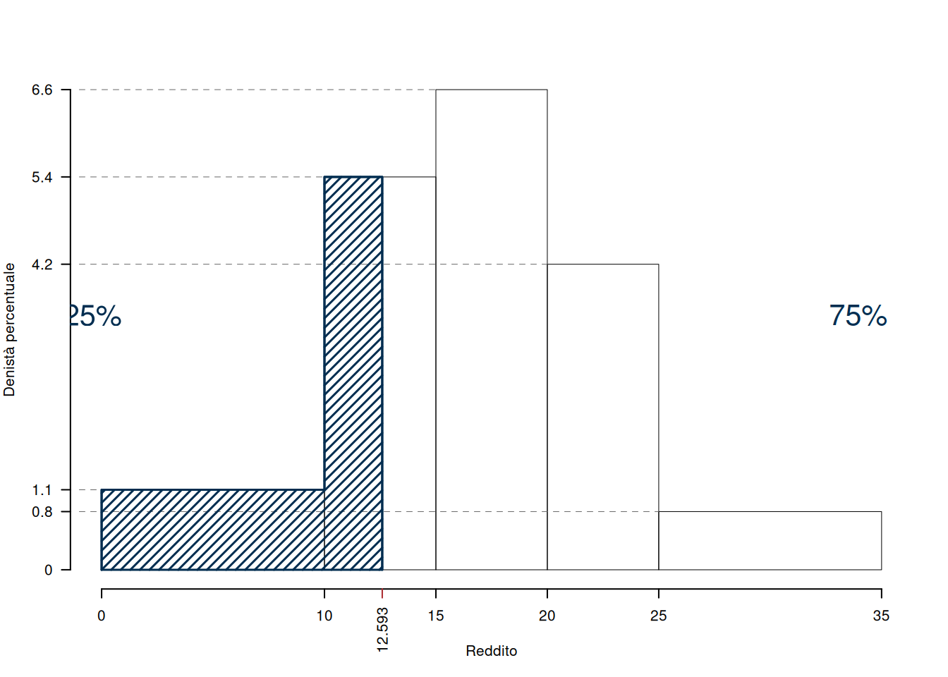 Se i dati sono quantitativi continui raccolti in classi e \(F\) è la funzione di ripartizione di \(X\) allora il percentile è quel valore tale che \[ F(x_p)=p \] ovvero a sinistra di \(x_p\) c’è il \(p\times 100\%\) dei dati e a destra di \(x_p\) il rimanente \((1-p)\times 100\%\). Per esempio sappiamo nel caso studiato sopra che \(x_{0.25}=12.593\) e quindi \(F(12.593)=0.25\).