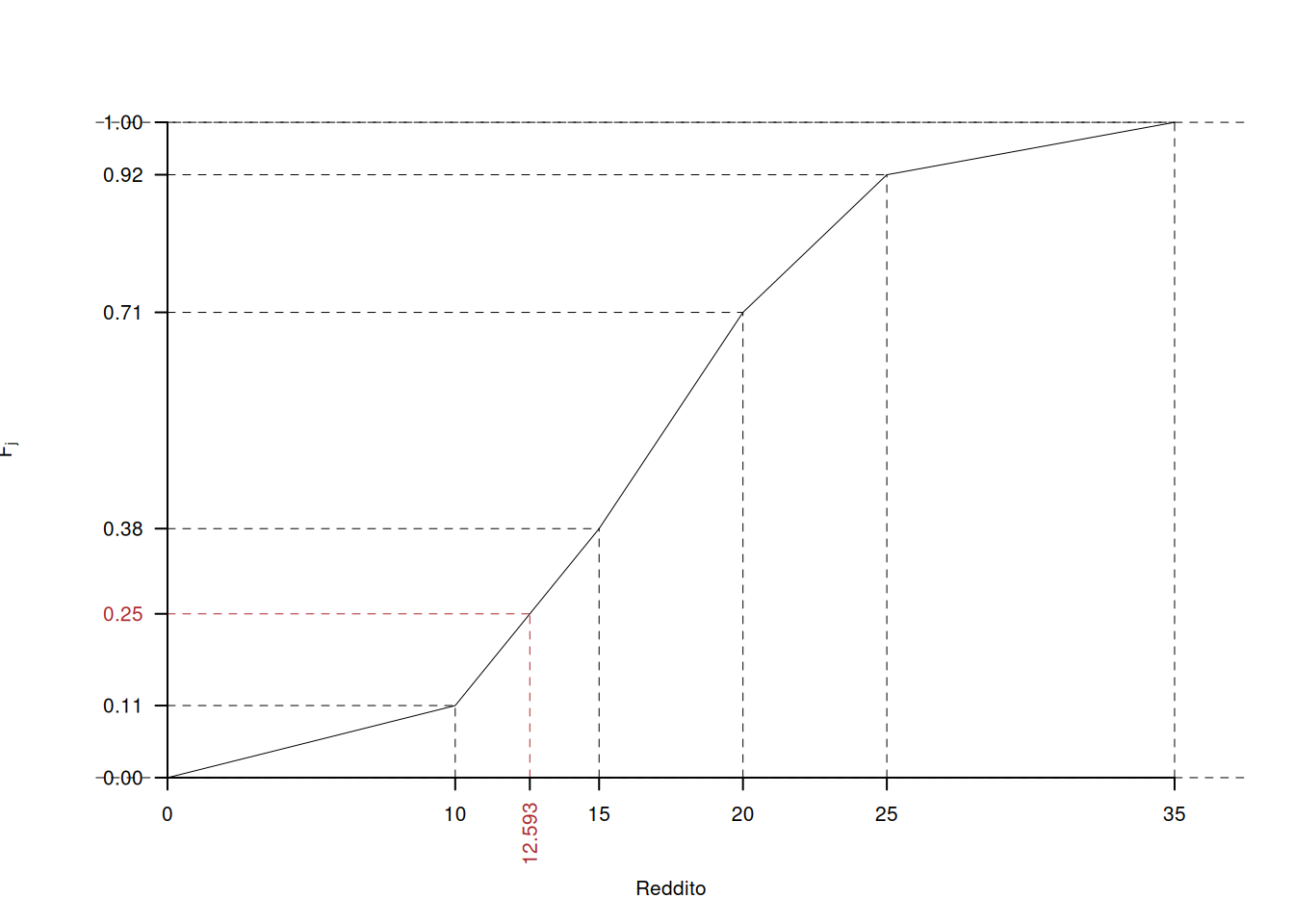 \[\begin{eqnarray*} p &=& 0.25 , \text{essendo }F_{ 2 }= 0.38 > 0.25 \Rightarrow j_{ 0.25 }= 2 \\ x_{ 0.25 } &=& x_{\text{inf}; 2 } + \frac{ { 0.25 } - F_{ 1 }} {f_{ 2 }} \cdot b_{ 2 } \\ &=& 10 + \frac {{ 0.25 } - 0.11 } { 0.27 } \cdot 5 \\ &=& 12.59 \end{eqnarray*}\]