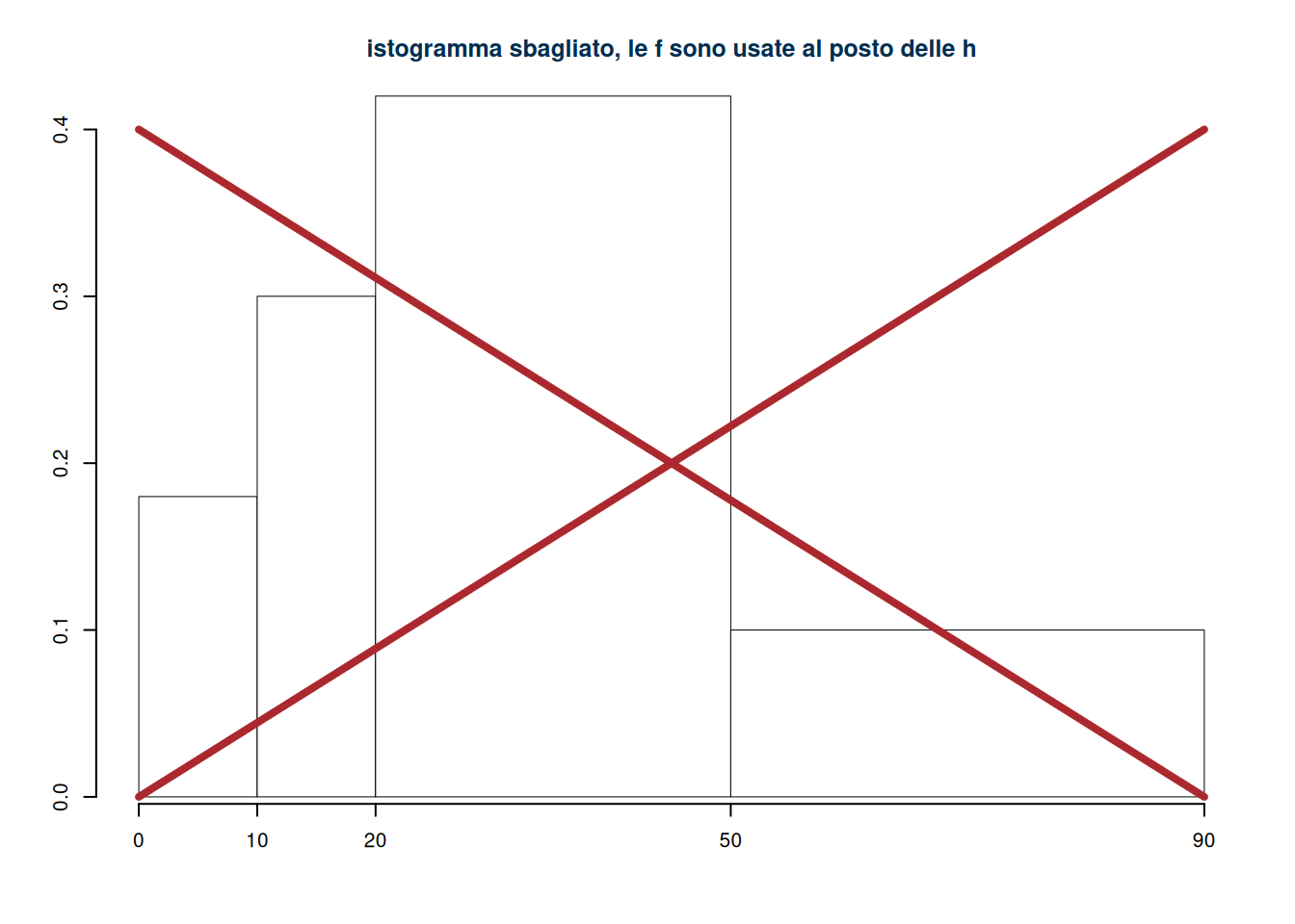 Se al posto delle \(h\) usiamo le \(f\) disegniamo l’istogramma sbagliato, . Notiamo che la classe \([20,50)\) viene sovra rappresentata. Infatti è vero che il 45% delle famiglie si trova in quella classe, ma è anche vero che l’ampiezza della classe molto grande e l’istogramma non rappresenta i dati.
