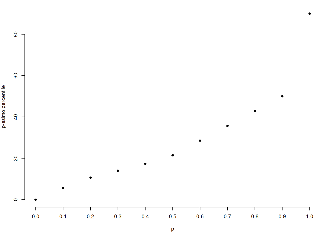 Il \(p\)-esimo percentile \(x_p\), \(0\leq p\leq 1\), è qual valore che divide la serie dei dati riordinati in due: il \(p\times100\%\) dei dati sono minori di \(x_p\) e \((1-p)\times100\%\) dei dati sono maggiori di \(x_p\). Se per esempio \(p=0.30\) allora il trentesimo percentile è quel valore che ha il 30% dei dati inferiore il 70% dei dati superiore. Il \(p\)-esimo percentile di una serie di dati è il valore che occupa la posizione \(\lfloor {p\times n}\rfloor+1\), dove \(\lfloor x\rfloor\) è l’operatore che estrae la parte intera di un numero decimale, ad esempio \(\lfloor 3.001\rfloor=\lfloor 3.21\rfloor=\lfloor 3.94\rfloor=3\).