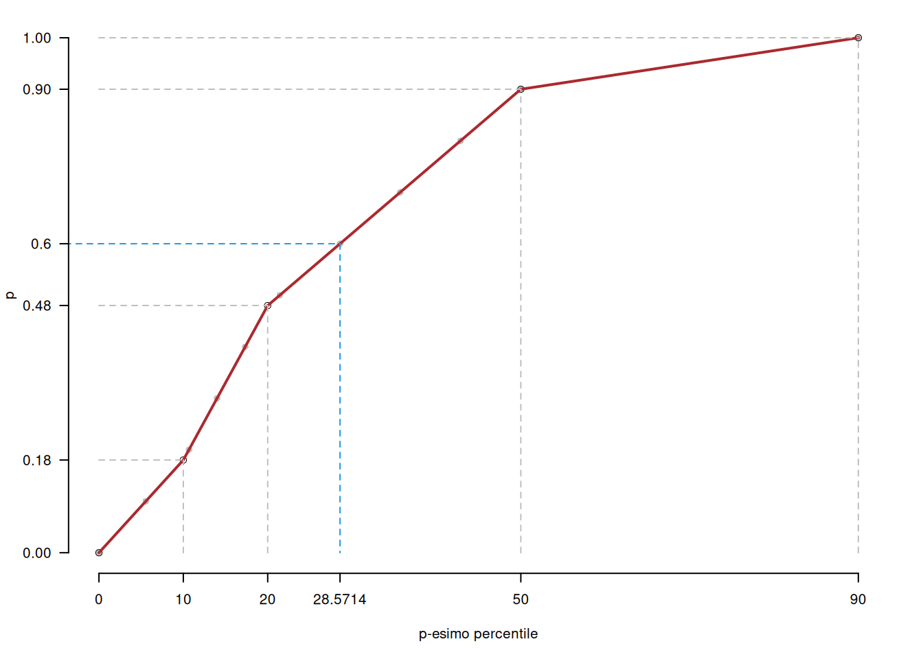 \[\begin{eqnarray*} p &=& 0.1 , \text{essendo }F_{ 1 }= 0.18 > 0.1 \Rightarrow j_{ 0.1 }= 1 \\ x_{ 0.1 } &=& x_{\text{inf}; 1 } + \frac{ { 0.1 } - F_{ 0 }} {f_{ 1 }} \cdot b_{ 1 } \\ &=& 0 + \frac {{ 0.1 } - 0 } { 0.18 } \cdot 10 \\ &=& 5.556 \end{eqnarray*}\]