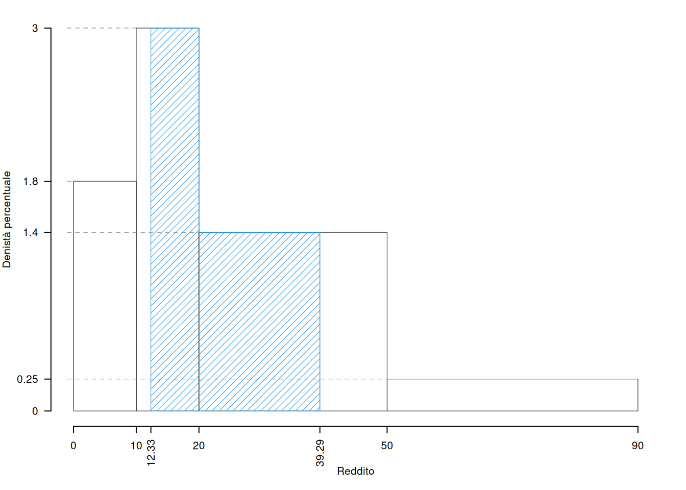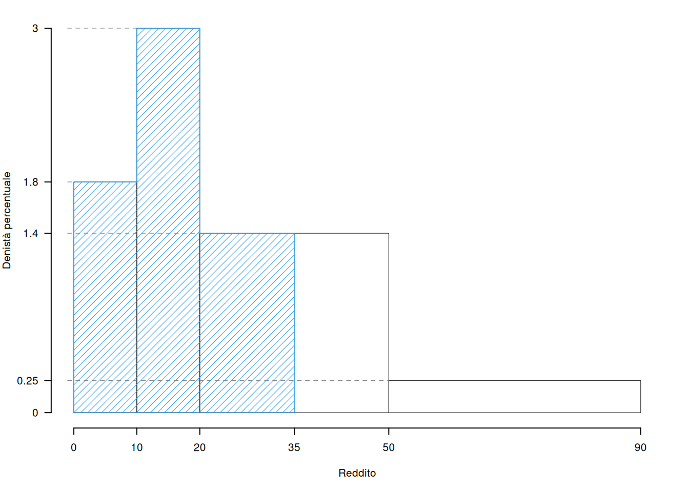 e osservare che la sua area misura 69. Infatti l’area è data dalla somma di \[\begin{eqnarray*} \%(X\leq 35) &=& f_1\times 100+f_2\times 100+(35-20)\times h_3 \\ &=& 18+30+15\times 1.4\\ &=& 69 \end{eqnarray*}\]