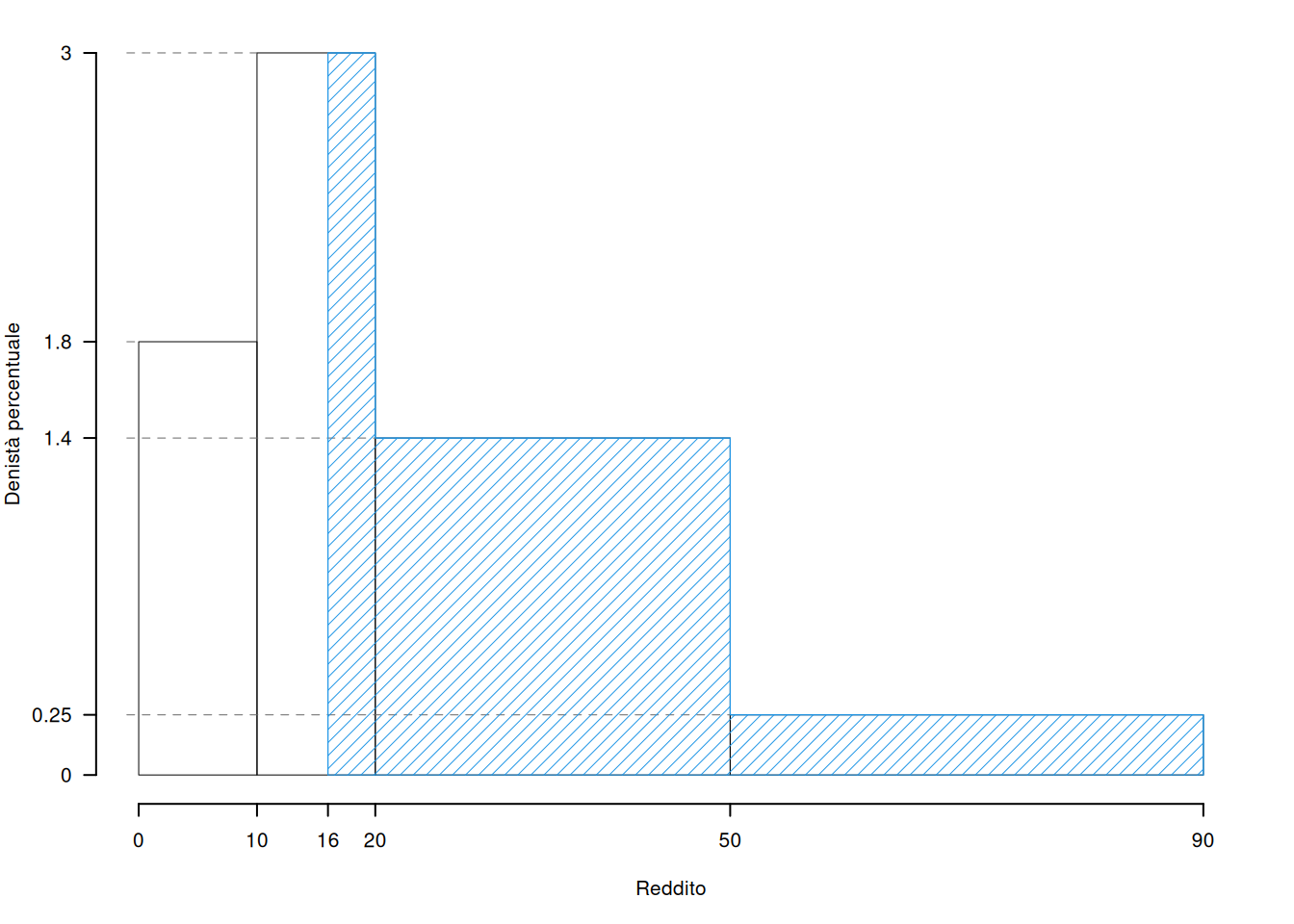 e osservare che la sua area misura 64. Infatti l’area si può vedere o direttamente calcolandola da 16 a 100 oppure si può valutarla come complemento: \[\%(X>16)=100\%-\%(X\leq 16)\] e quindi: \[\%(X\leq 16)=f_1\times 100+(16-10)\times h_2=36\] Quindi \(\%(X>16)=100-36=64\)