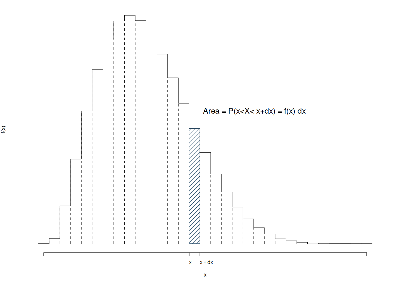 L’idea è di dividere il supporto in classi e costruire un istogramma di densità tale che l’area sottesa ad una classe si la probabilità della classe stessa. Se per esempio dividiamo l’intervallo in 11 intervalli, otteniamo, graficamente