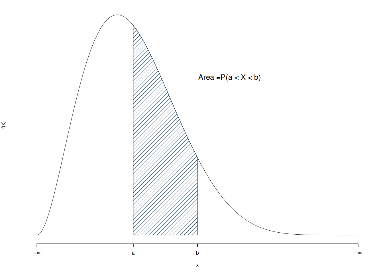 \[P(a<X<b)=\int_{a}^{b}f(x)dx=F(b)-F(a)\]