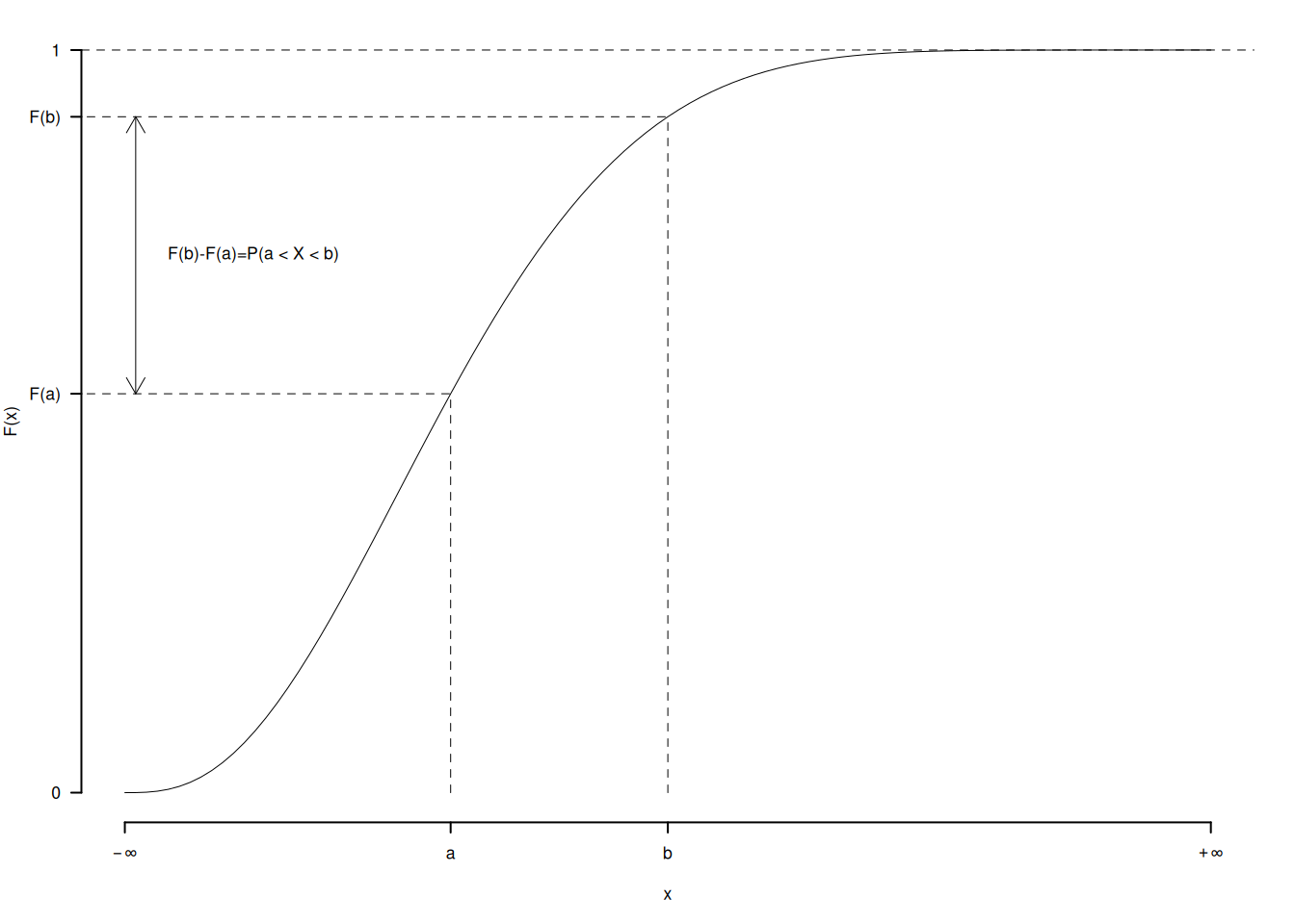 - \(P(a < X \le b) = F(b) - F(a)\).