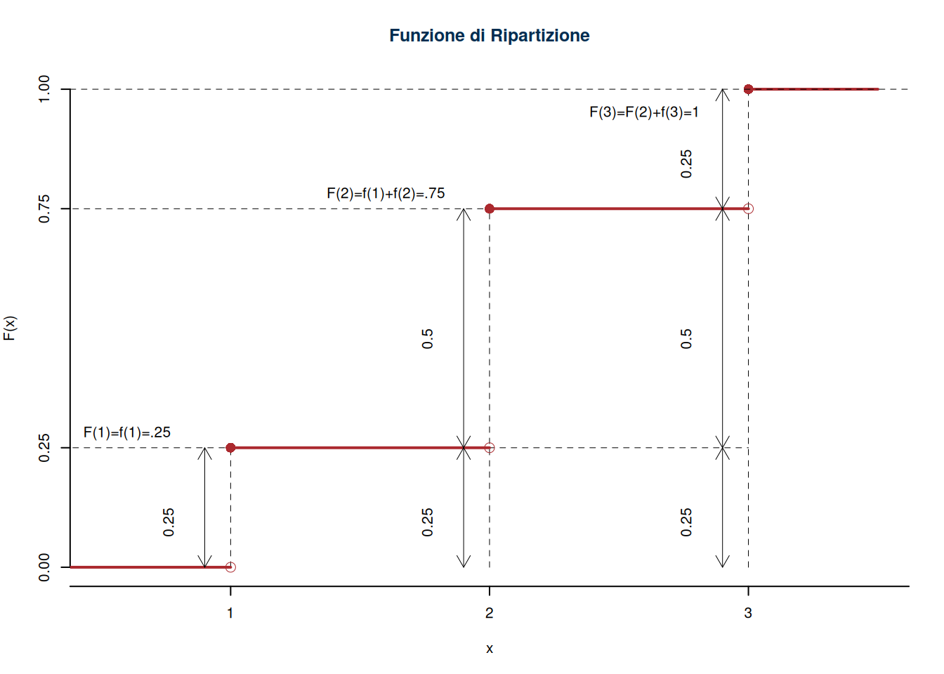 Analogamente possiamo costruire la funzione di ripartizione cumulando le probabilità. Nell’esempio di sopra otterremmo: