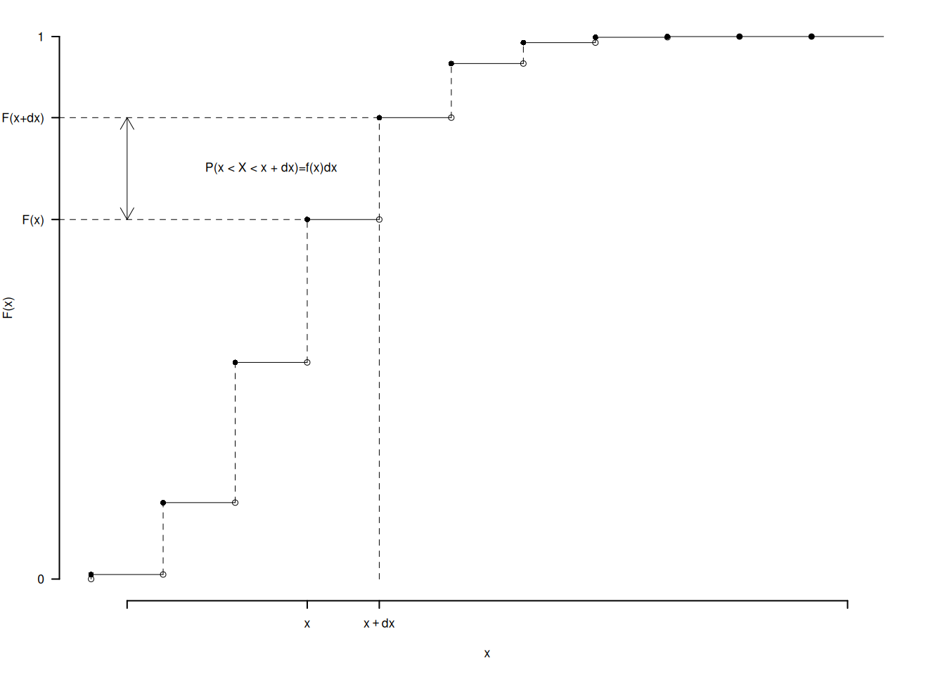 Definizione 6.3 (Funzione di Ripartizione di una VC) \[ F(x)=P(X\le x)=\sum_{x^*\le x} f(x^*) \]