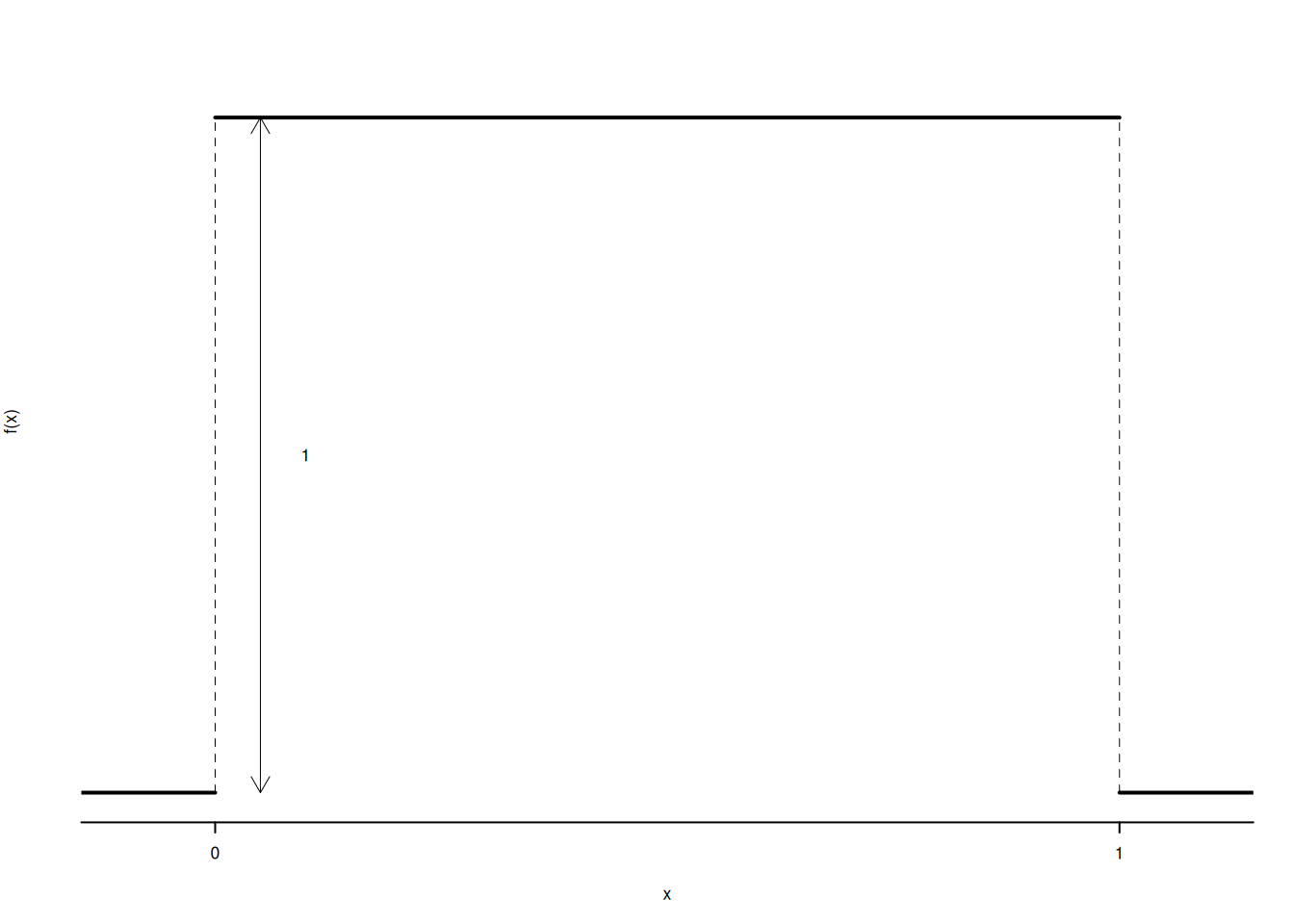 La VC uniforme è utile per prendere confidenza con le VC continue ed è definita ne seguente modo: \(S_X=[0,1]\) e \[ f(x)= \begin{cases} 1,~~\text{se $0\le x \leq 1$}\\ 0,~~\text{altrimenti} \end{cases} \] Si tratta di una funziona a gradino che vale uno nell’intervallo [0,1] e zero altrove.
