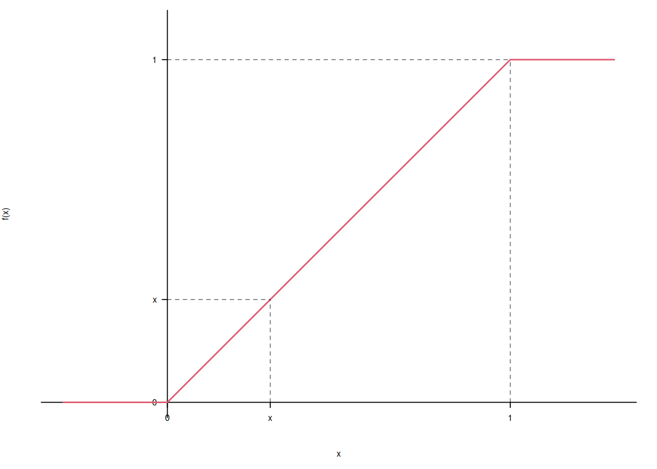 \[ F(x)=\begin{cases} 0,~~\text{se $x<0$}\\ x,~~\text{se $0\leq x \leq 1$}\\ 1,~~\text{se $x>1$}\\ \end{cases} \]