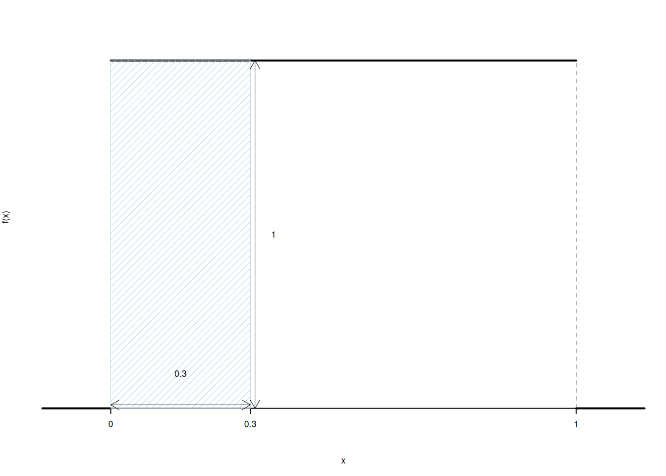 Ovvero la probabilità che \(X\leq x\) è l’area tra zero ed \(x\) della funzione a gradino. Per esempio \[ F(0.3)=P(X\leq 0.3) =(\text{base = 0.3})\times(\text{altezza = 1})=0.3 \]