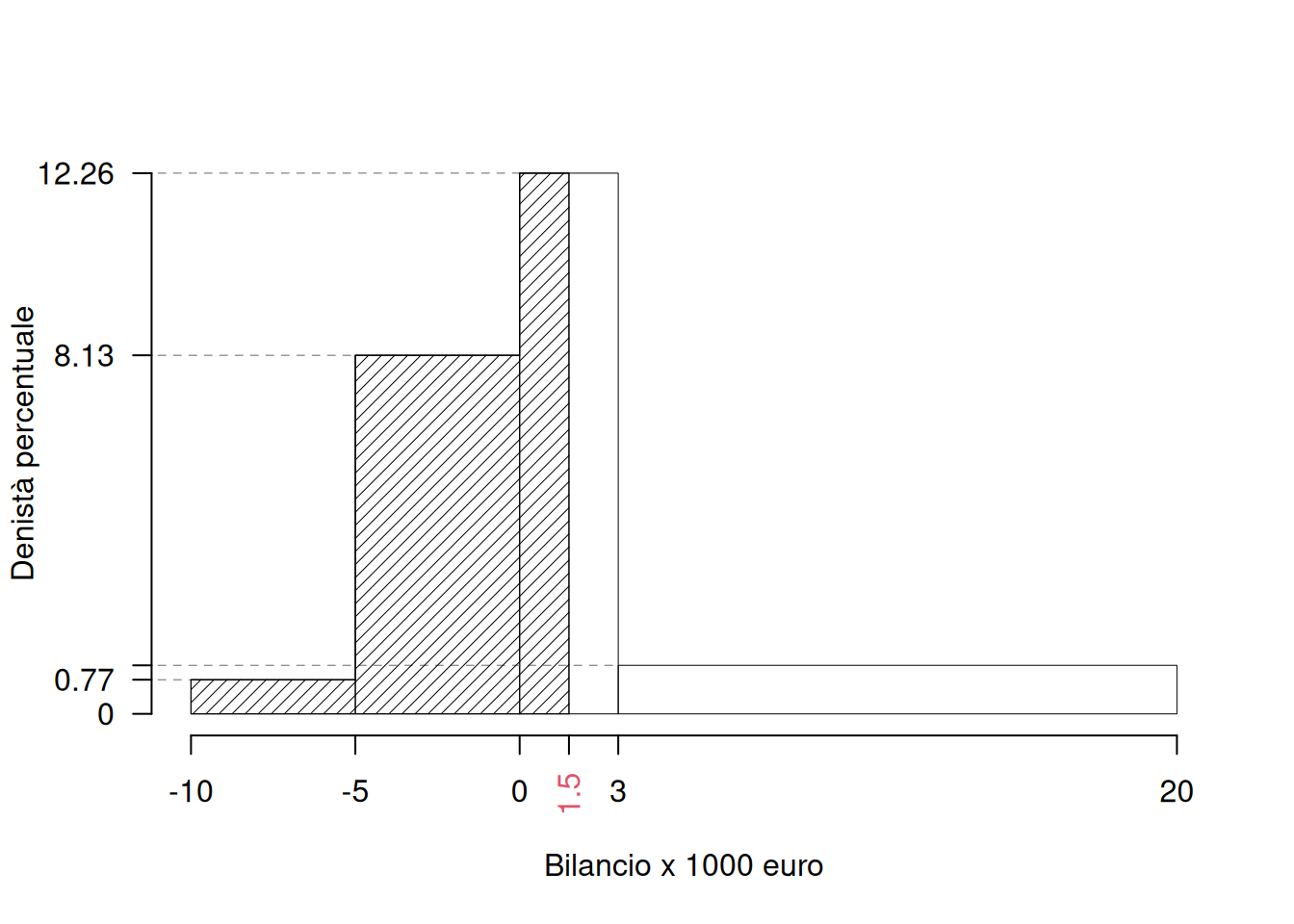 Su un campione di \(155\) aziende è bilancio annuo (espresso in migliaia di euro). Qui di seguito la distribuzione delle frequenze percentuali:| \([\text{x}_j,\) | \(\text{x}_{j+1})\) | \(f_{j\%}\) |
