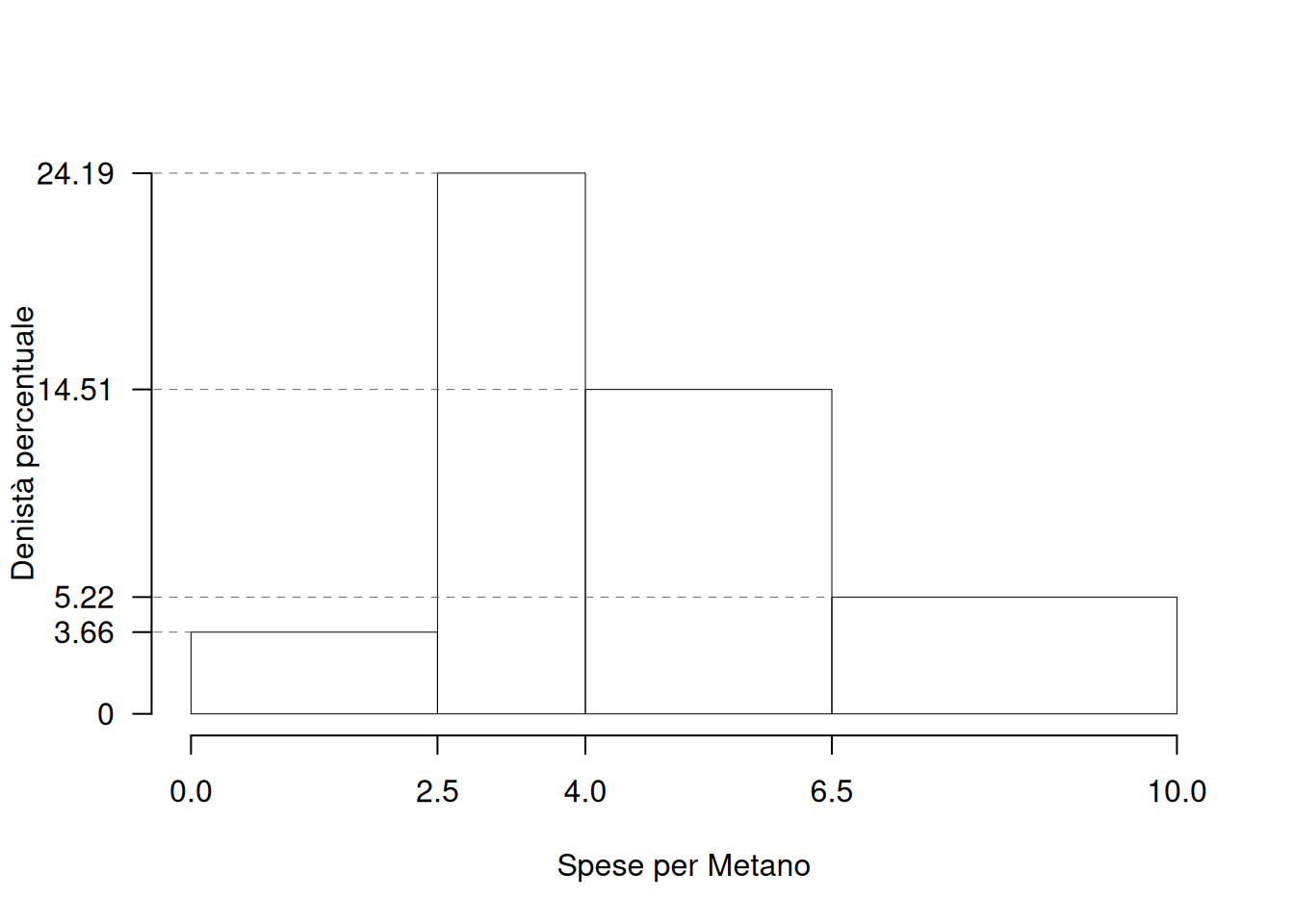 Su un campione di \(350\) aziende è stato rilevato l’utile del 2020, espresso in centinaia di migliaia euro; qui di seguito l’istogramma di densità percentuale.