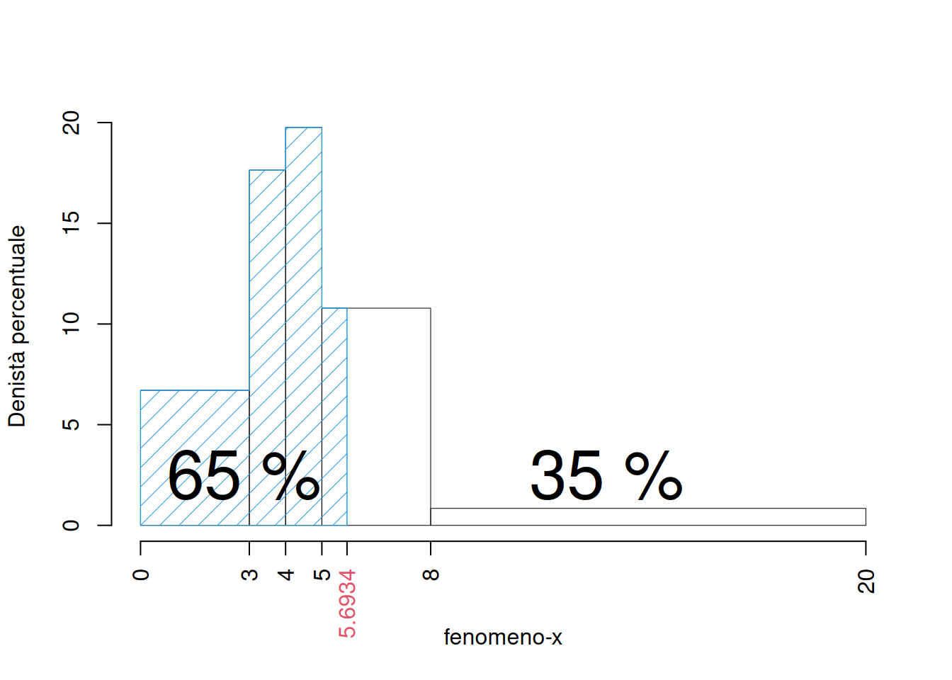 - calcolare il valore approssimato del percentile \(65\)-esimo, e tracciarlo nell’istogramma.