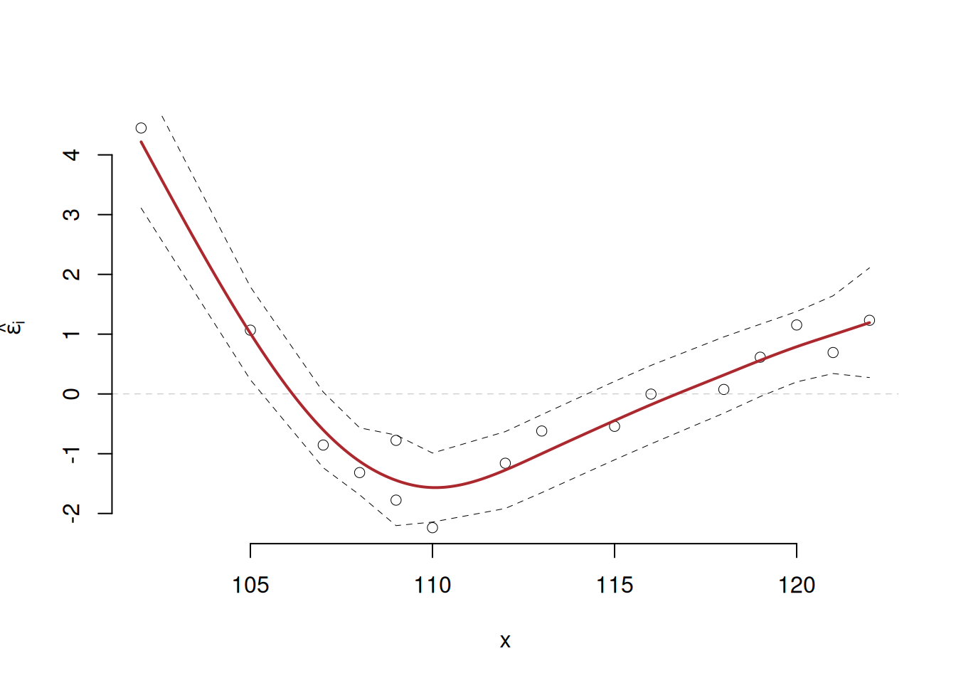 E quindi\[\begin{eqnarray*} V(\hat\beta_{1}) &=& \frac{\sigma_{\varepsilon}^{2}} {n \hat{\sigma}^{2}_{X}} \\ \widehat{V(\hat\beta_{1})} &=& \frac{S_{\varepsilon}^{2}} {n \hat{\sigma}^{2}_{X}} \\ &=& \frac{ 14.08 } { 16 \times 72.24 } = 0.01218 \\ \widehat{SE(\hat\beta_{1})} &=& \sqrt{ 0.01218 }\\ &=& 0.1104 \end{eqnarray*}\]